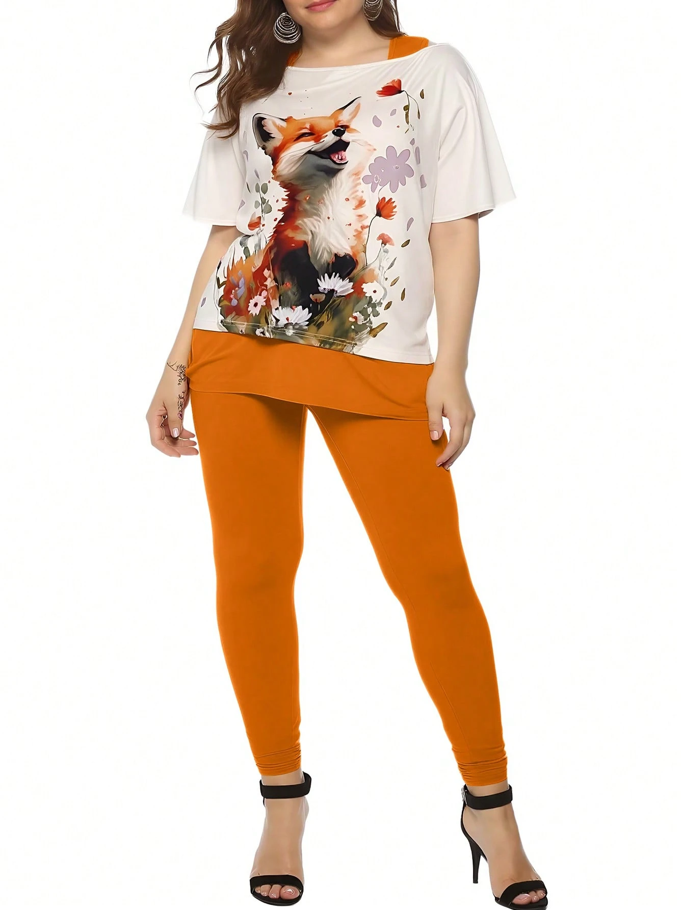 3pcs/Set Plus Size Women Fox Printed Short Sleeve T-Shirt, Tank Top And Shorts Casual Outfit