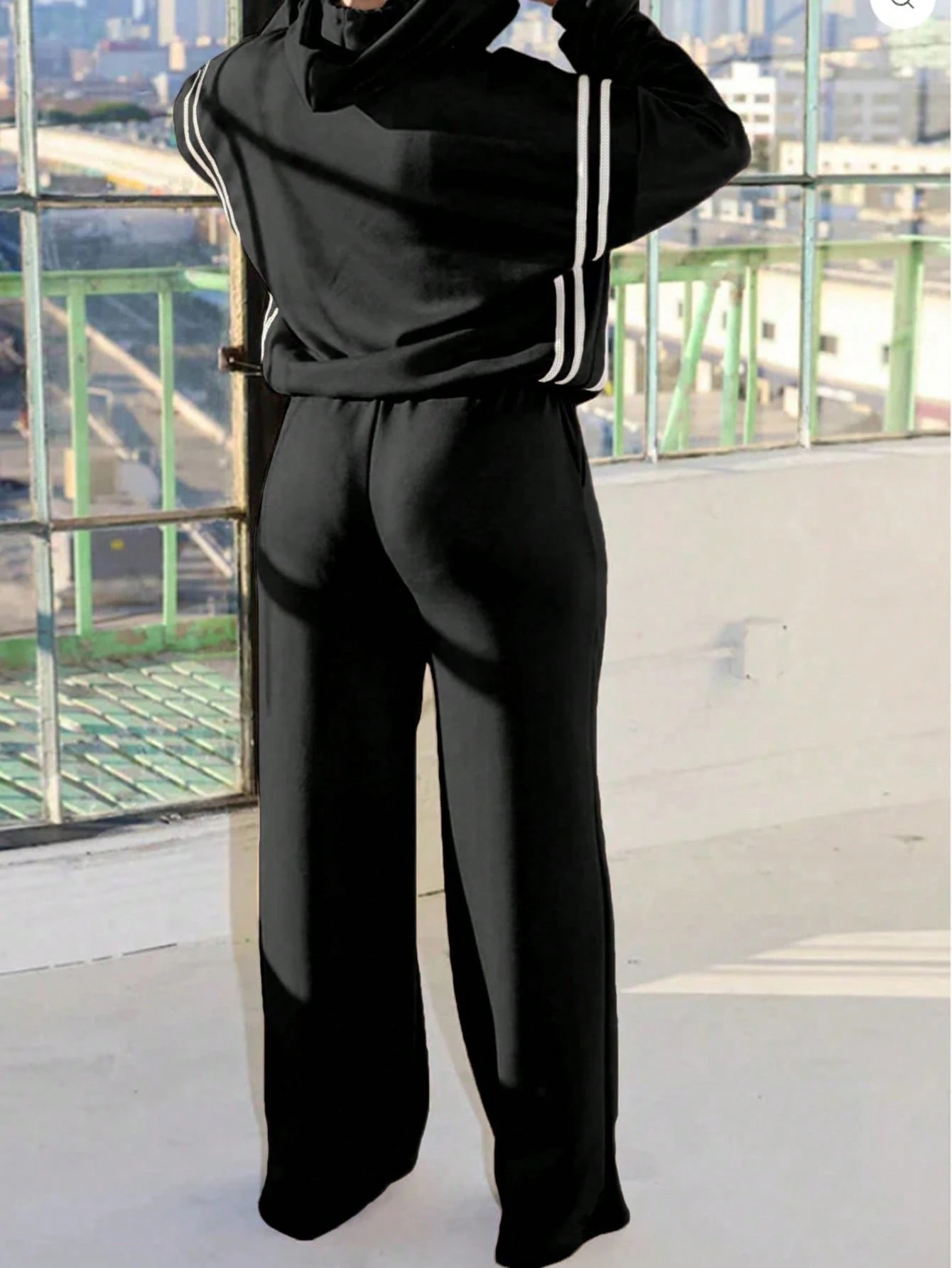 Plus Size Women Striped Drop Shoulder Drawstring Hooded Sweatshirt And Pants 2 Pieces Casual Set