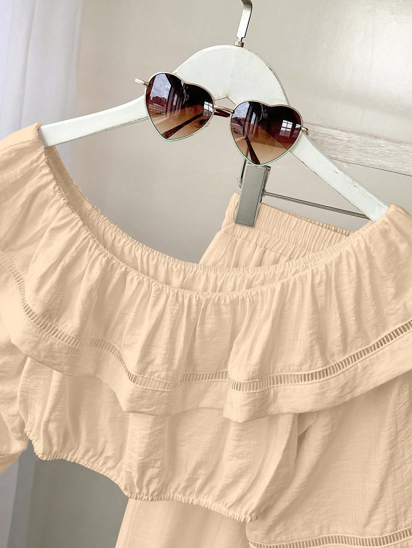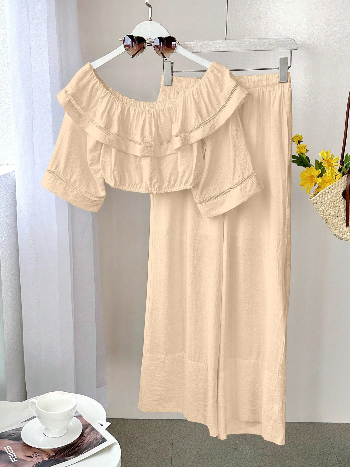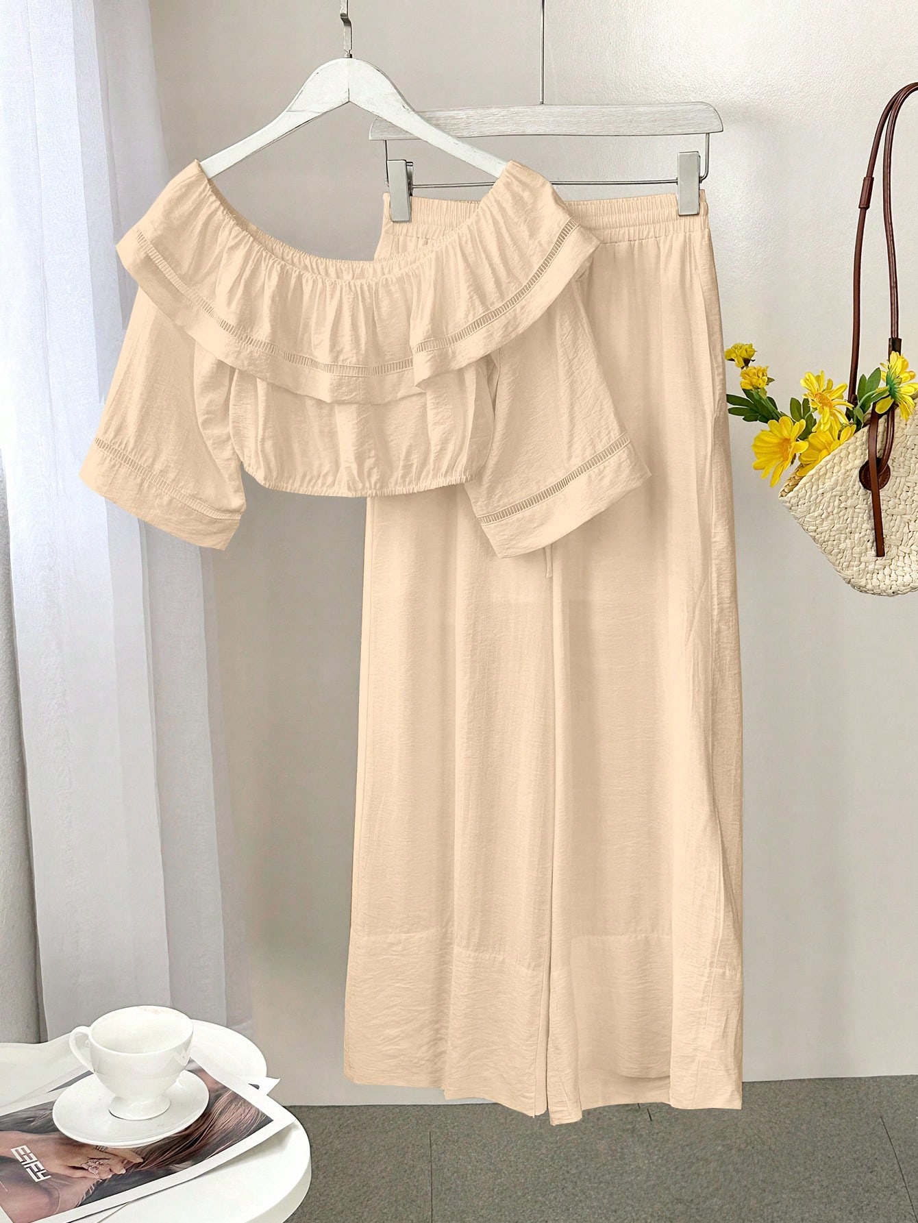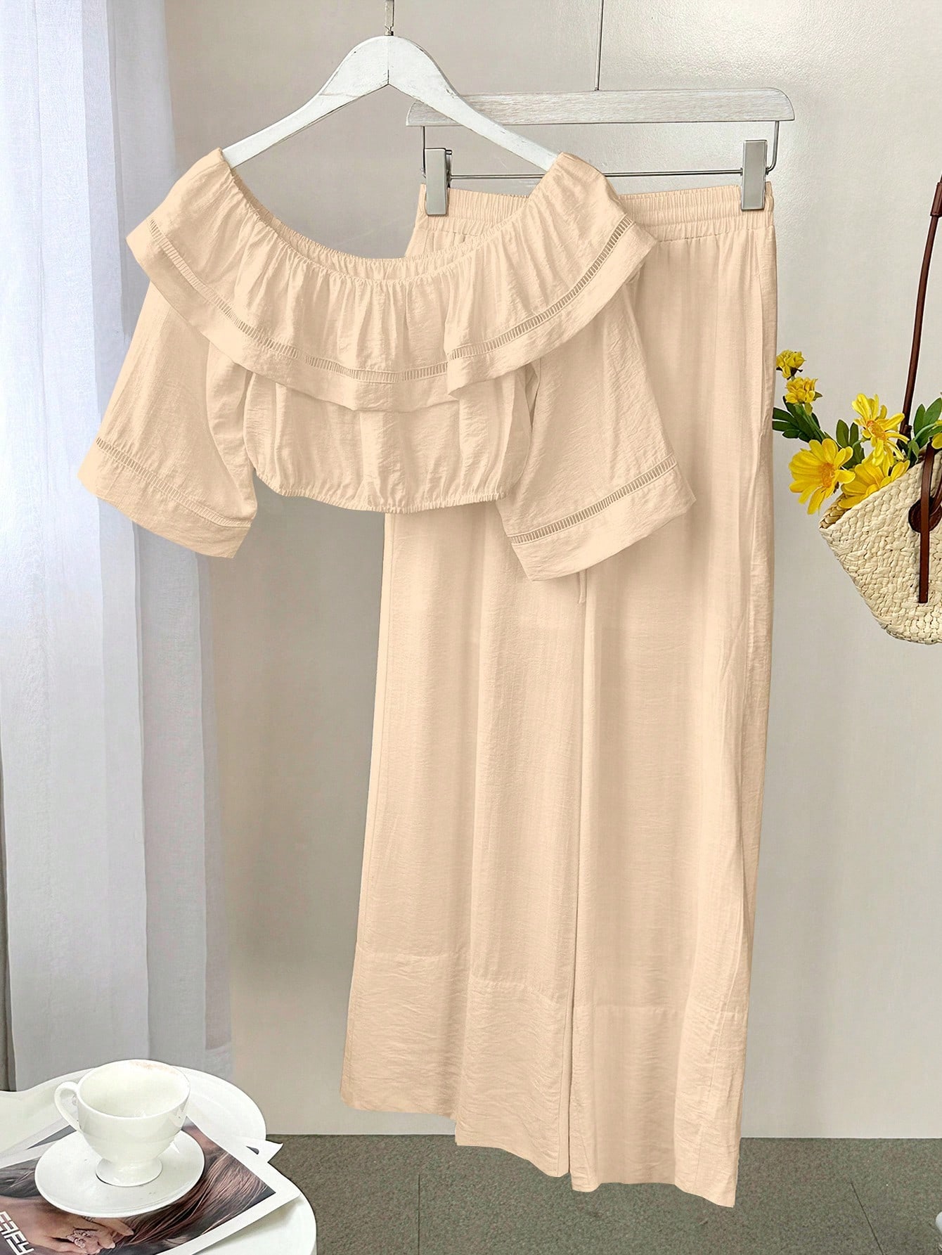Neckline : Off the Shoulder : Home : Lined : Ramadan, Id al-Adha, Eid al-Fitr : No : Plain : Casual : Ruffle, Pocket, Shirred : Apricot : Blouse : Half Sleeve : Pants : Long : Crop : Woven Fabric : 80% Viscose,20% Polyamide : Loose : Non-Stretch : Machine wash or professional dry clean : No”,”attr_name_en”:”Sheer”,”attr_id”:207,”value_sort”:0,”attr_desc”:””,”attr_image”:””,”attrImgList”:null,”attr_sort”:79,”attr_value_id”:”459″,”attr_value_id_for_sort”:0,”attr_value_en”:”No”}