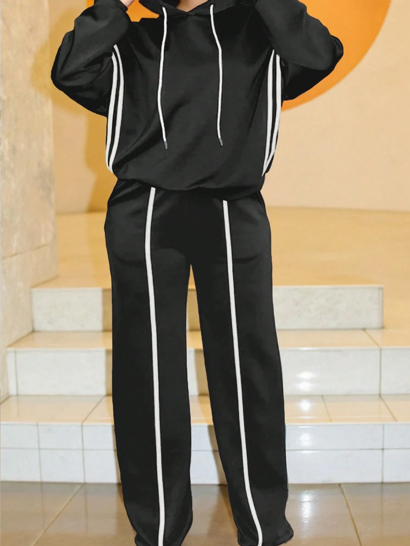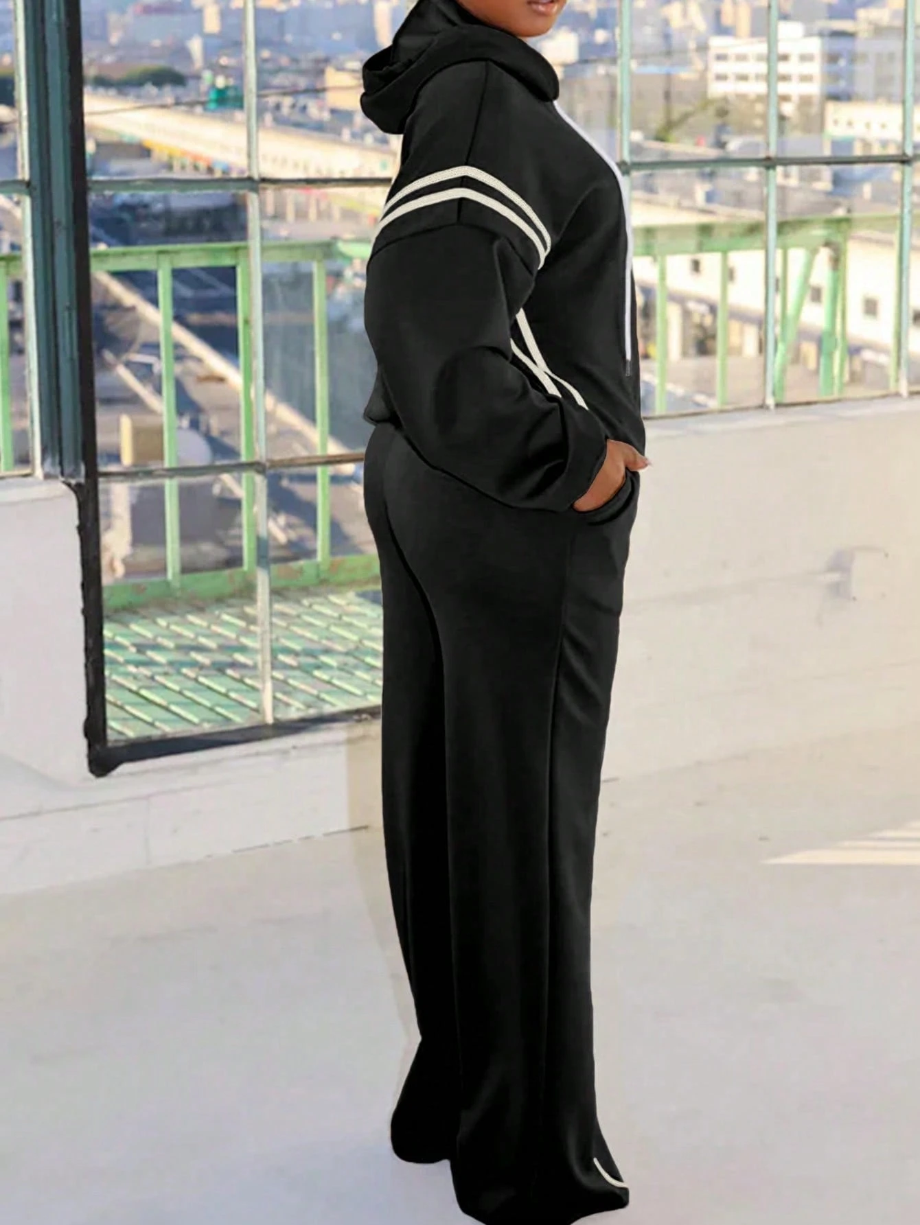 Plus Size Women Striped Drop Shoulder Drawstring Hooded Sweatshirt And Pants 2 Pieces Casual Set