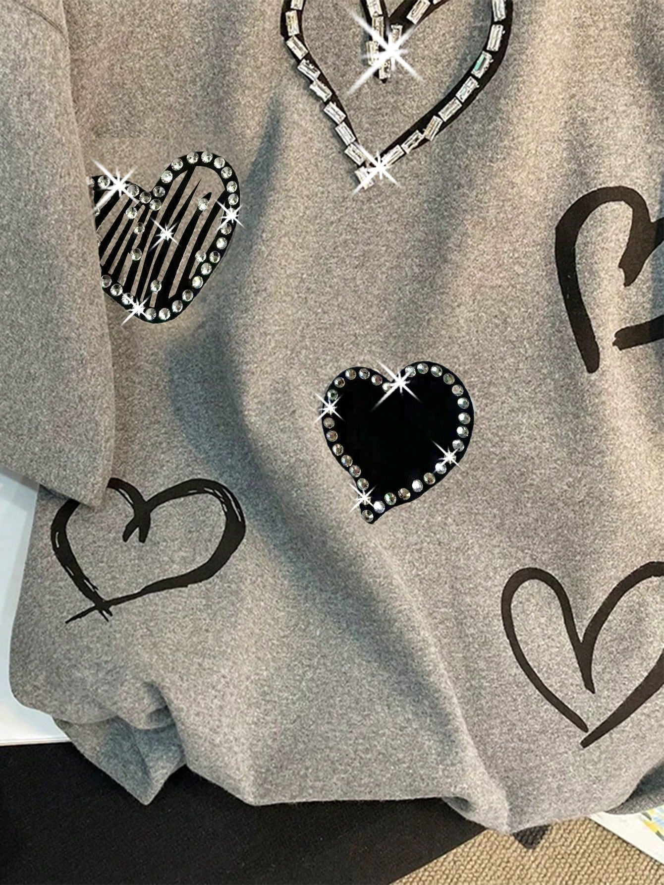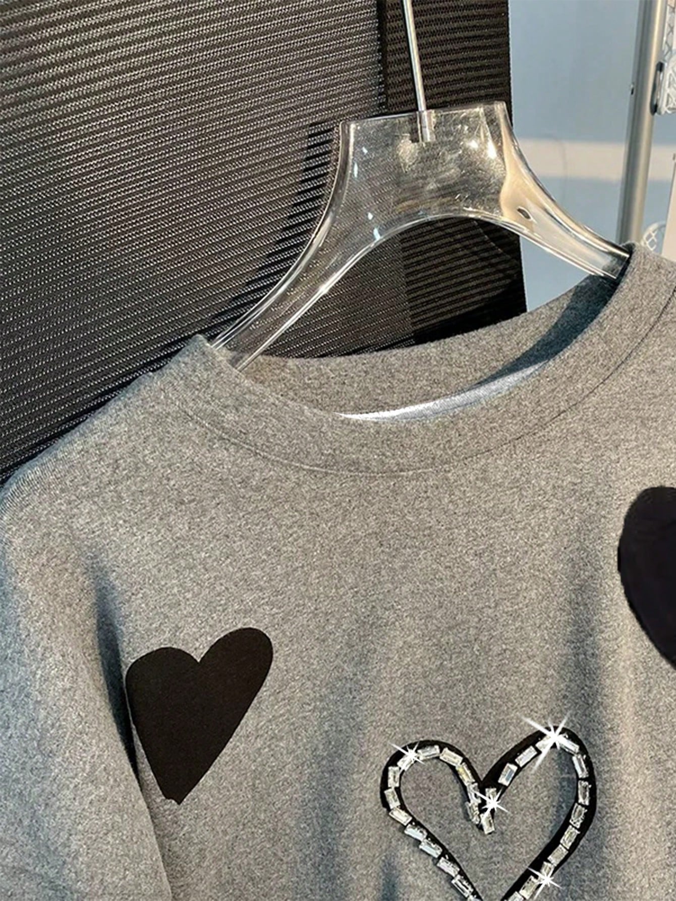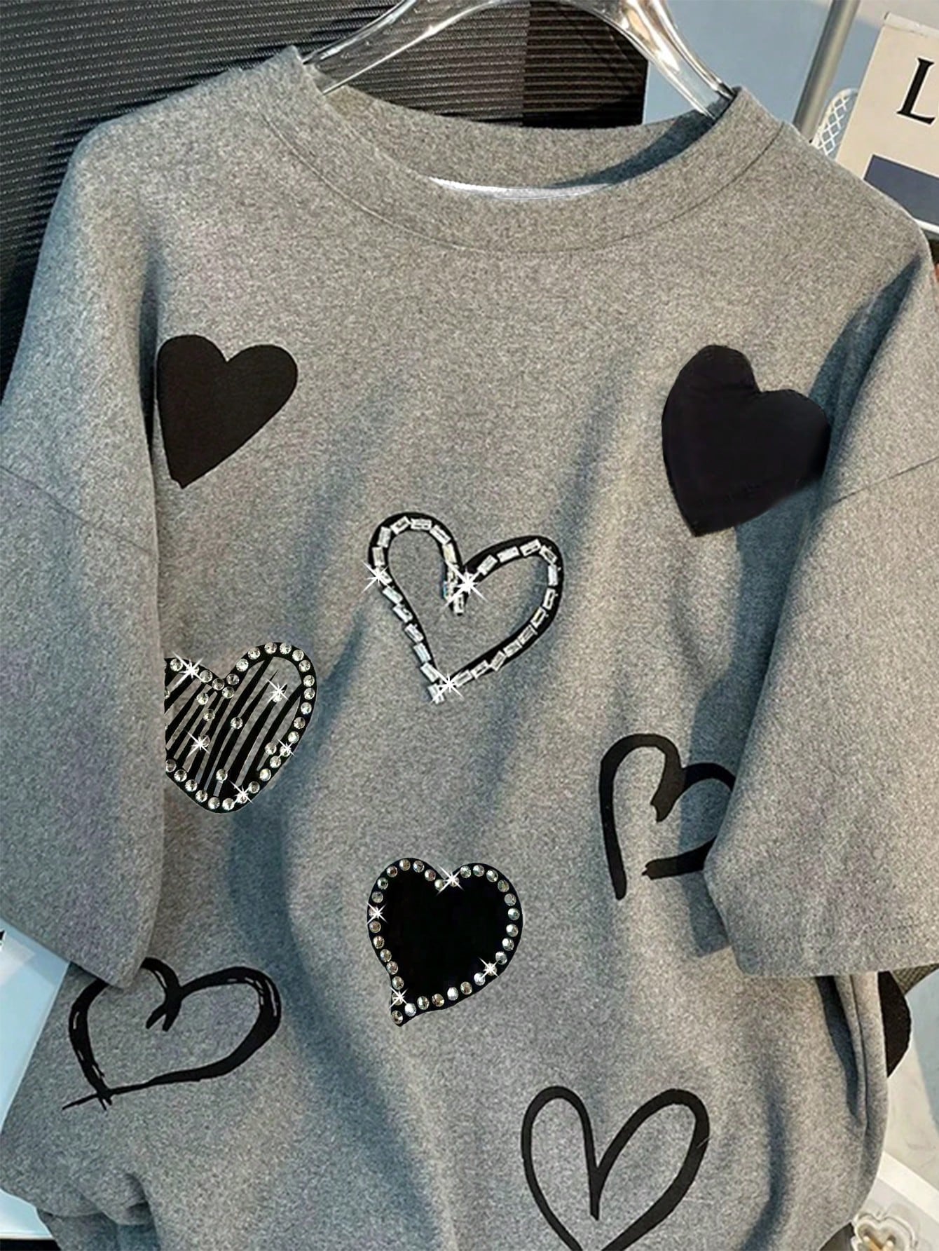 Home Women Clothing Women Tops, Blouses & Tee Women T-Shirts Women Heart Print Rhinestone Crew Neck T-Shirt, Fashionable For Summer
