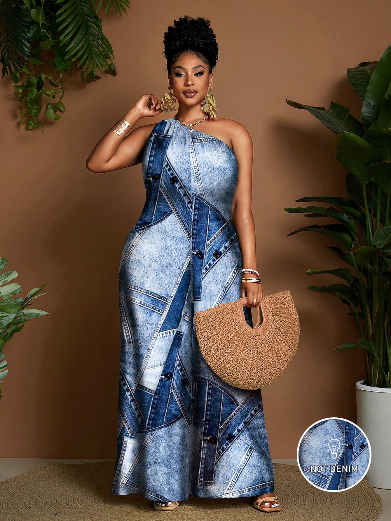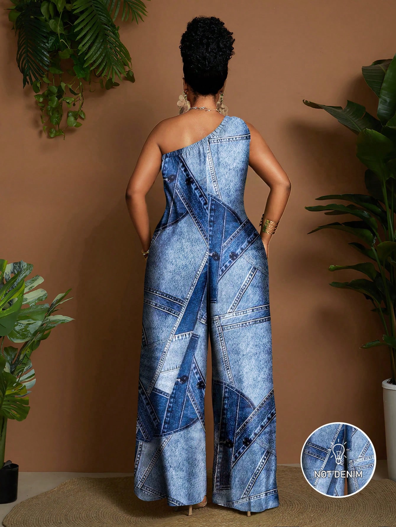 Plus Size Women Woven Faux-Denim Pattern Digital Print Sleeveless Loose Jumpsuit, Casual Chic Style