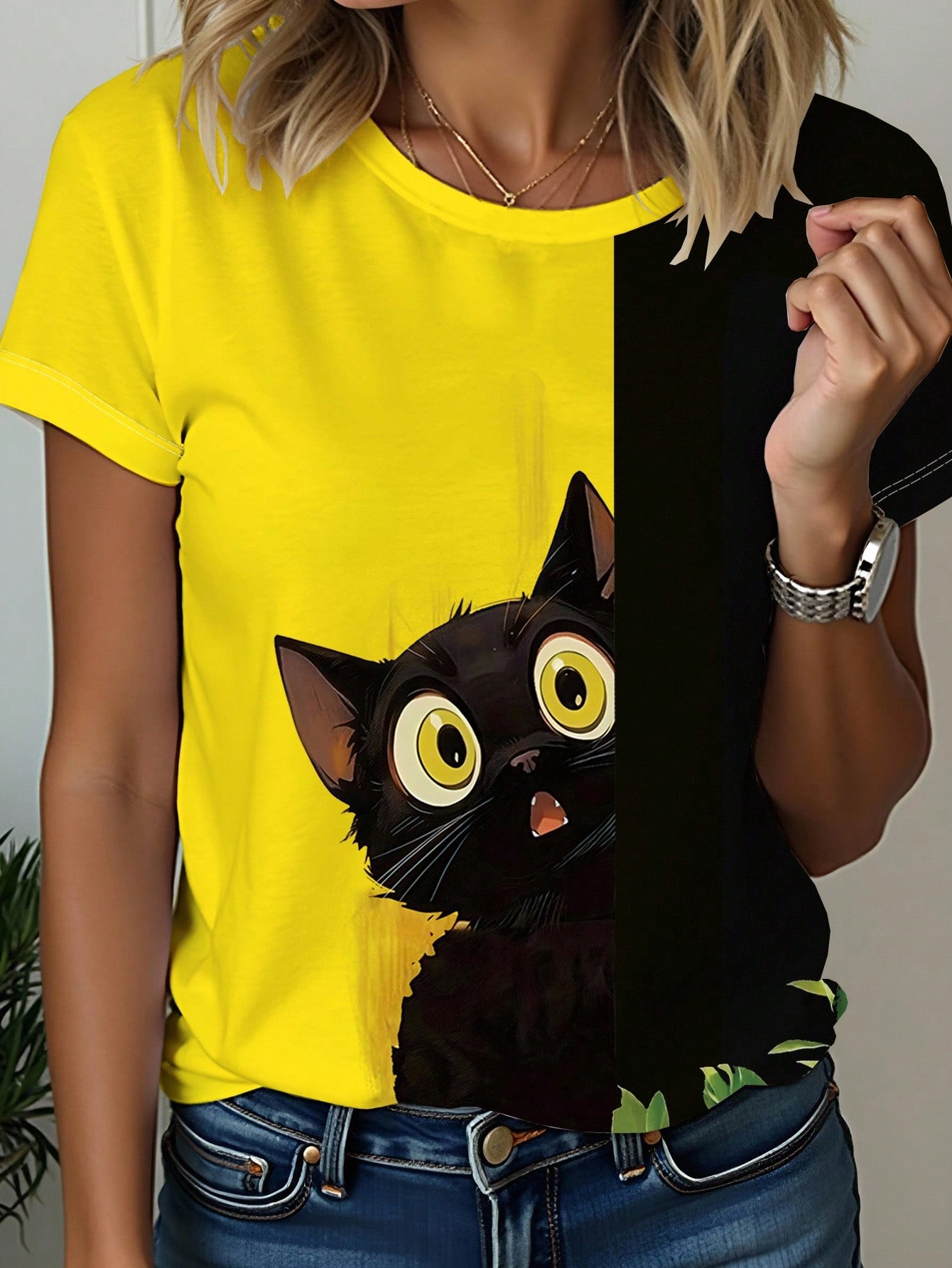 Home Women Clothing Women Tops, Blouses & Tee Women T-Shirts Women’s Cat Graphic Print Short Sleeve Round Neck T-Shirt, Casual Women Clothes For Spring/Summer